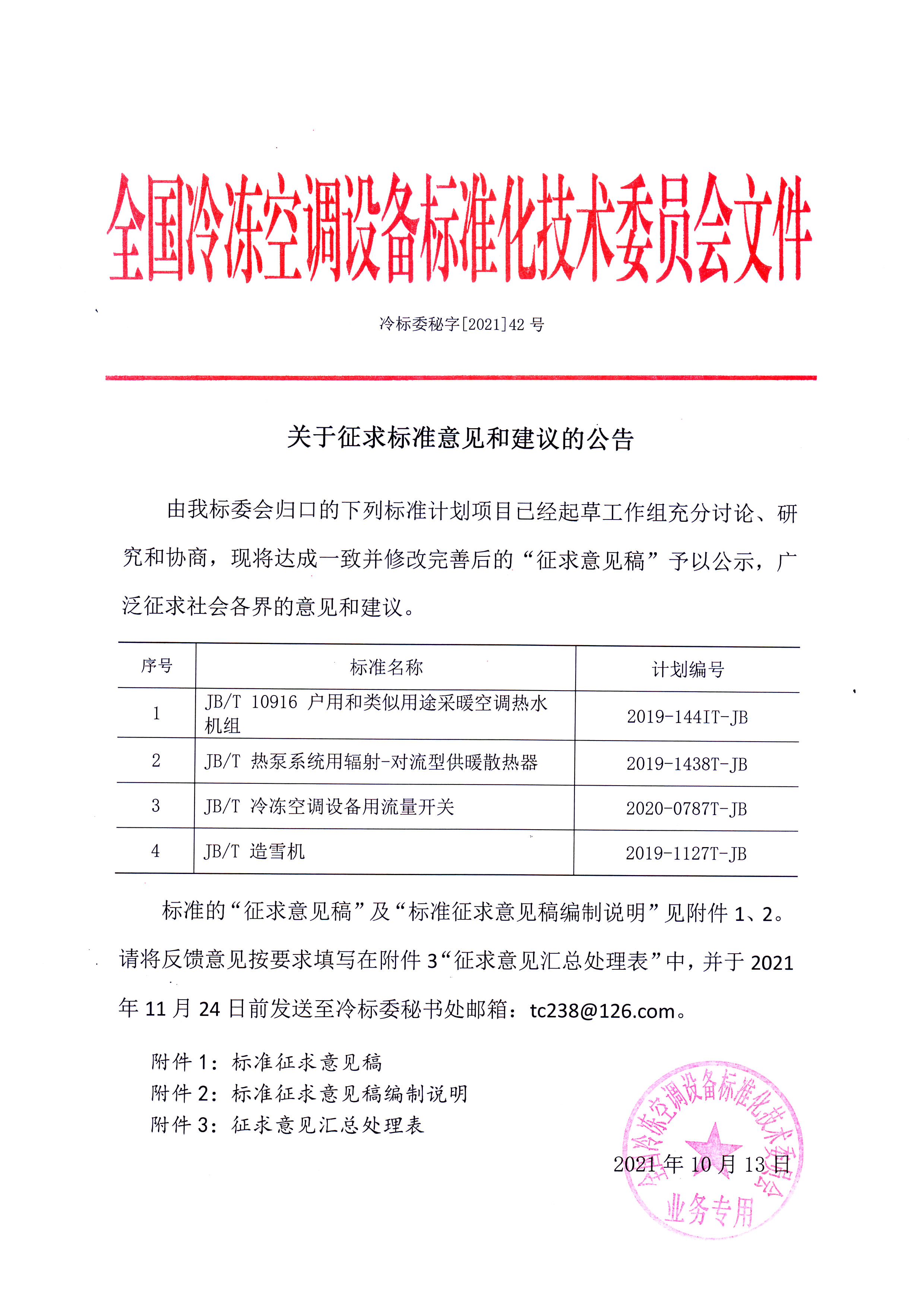 請將意見和建議填寫在附件的“征求意見匯總處理表”中,并于2021年11月24日前發送至冷標委秘書處郵箱:tc238@126.com。