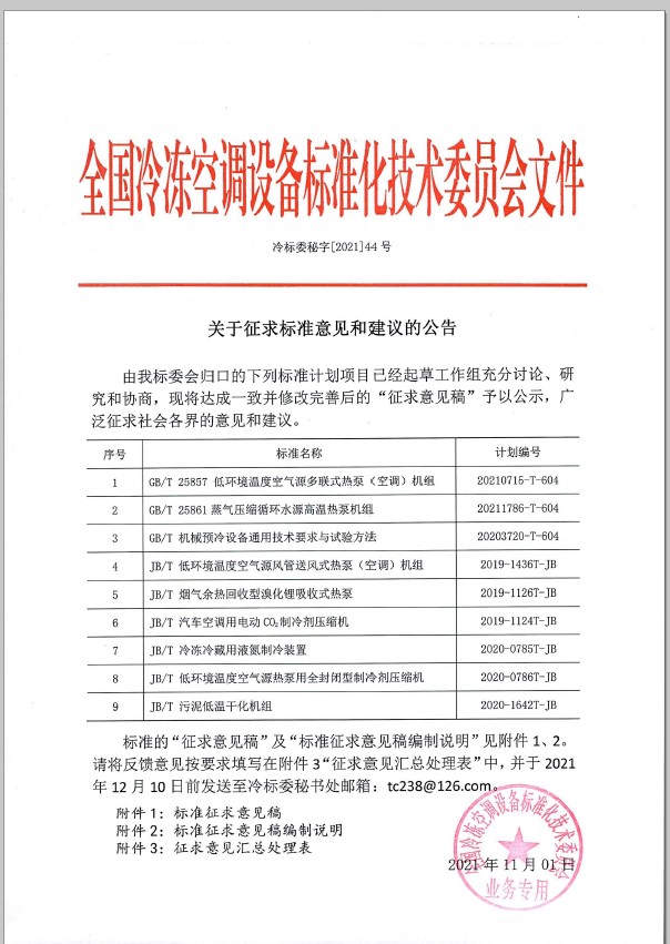 請對GB/T 25857 《低環(huán)境溫度空氣源多聯(lián)式熱泵(空調(diào))機組》等8項標準感興趣的單位直接在下列附件中獲取標準的征求意見稿,并于2021年12月10日前將填寫的“征求意見匯總處理表”回復(fù)郵箱:tc238@126.com。